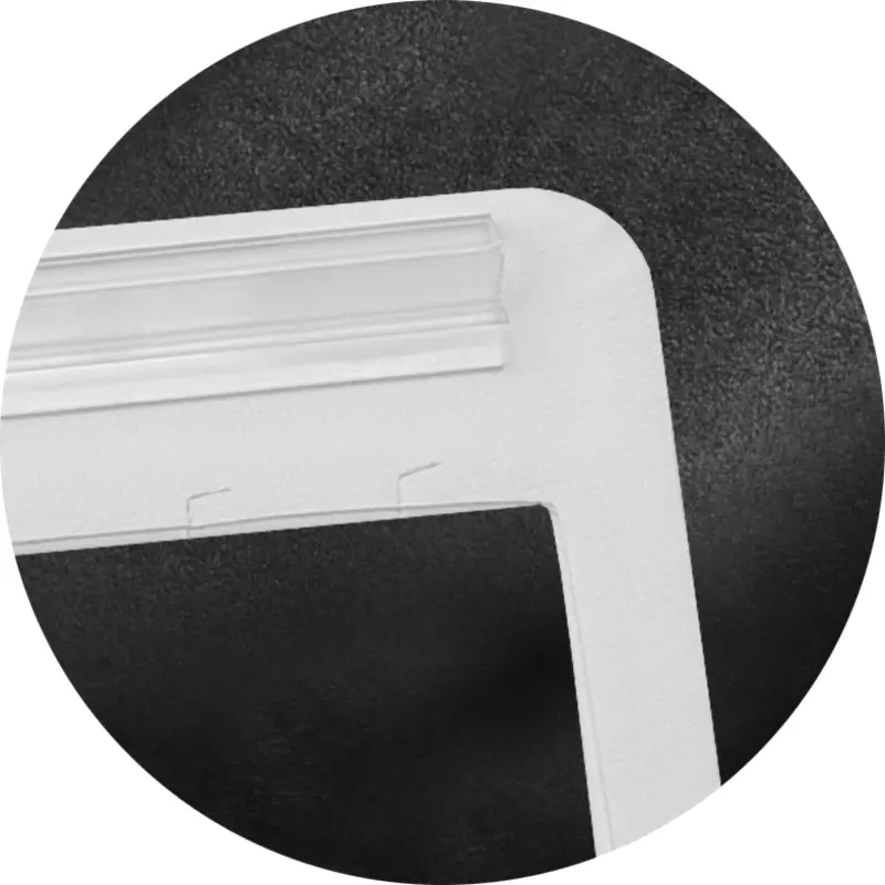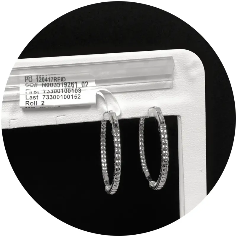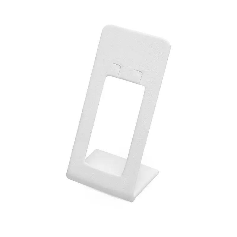 White leatherette. Hoop stand has an L slit for easy on and off of jewelry. Hidden plastic clip tag holder. This stand can be paired with a matching triple hoop stand (ES03NWHT).