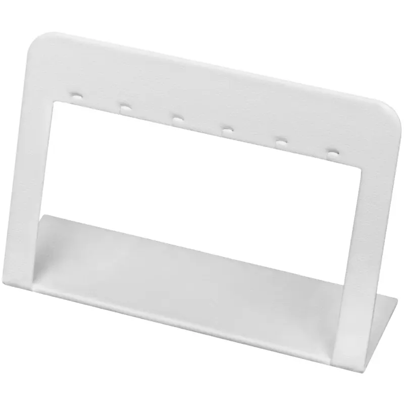 White leatherette. Triple hoop stand with holes for 6 earrings. Hidden plastic clip tag holder. This stand can be paired with a matching single hoop stand (ES01NWHT).