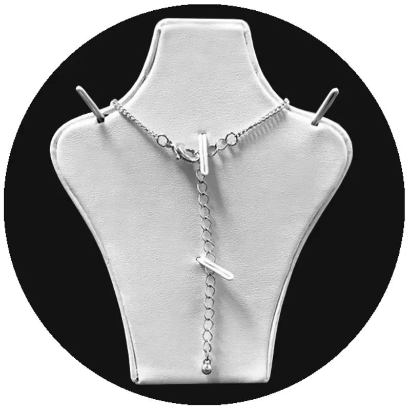 White leatherette necklace display bust with shoulder wires plus two wires in back for holding chains in the proper place.