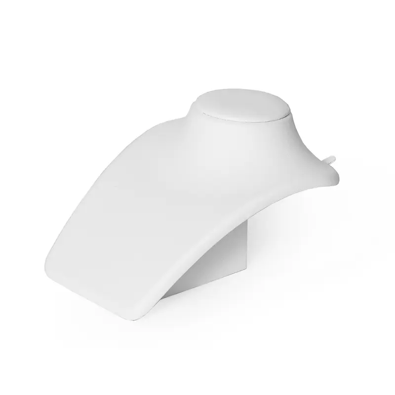 White leatherette neck form with shoulder tabs and magnetic back door for holding chains in place. Back also has a pocket for excess chains.