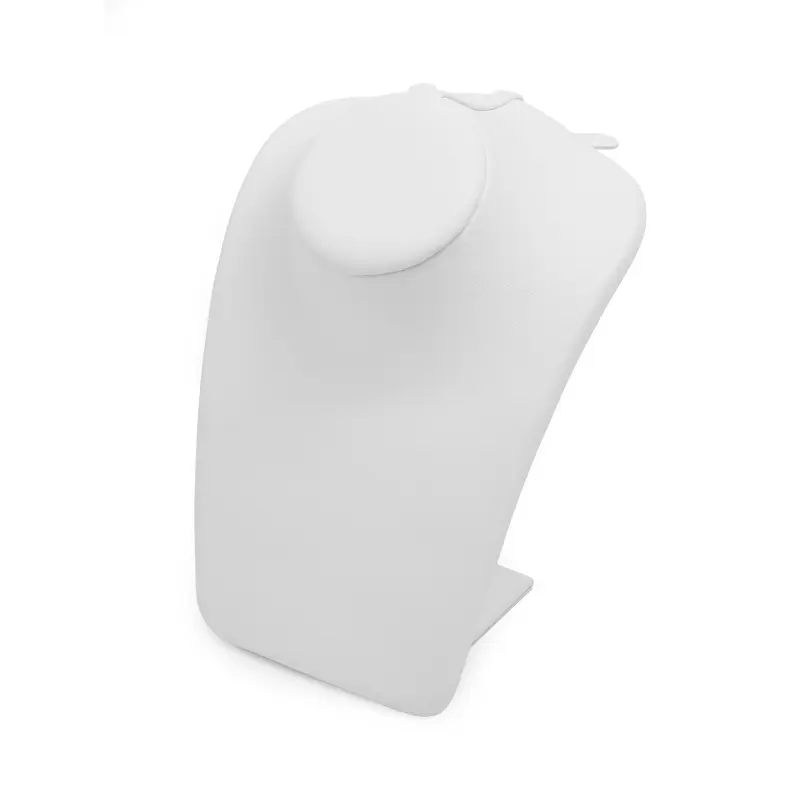 White leatherette neck form with shoulder tabs and magnetic back door for holding chains in place. Back also has a pocket for excess chains.