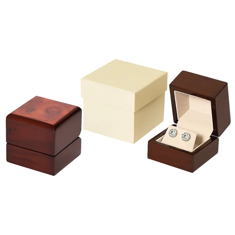 Rocket presents our earring box fromthe "Burl Wood Boxes" collection. These sophisticated luxurious mahogany boxes are inset with burl wood and lacquered to a mirror finish. Your jewelry will be presented by the rich contrasting interior of cream Italian suede. A two piece paper box is also included.