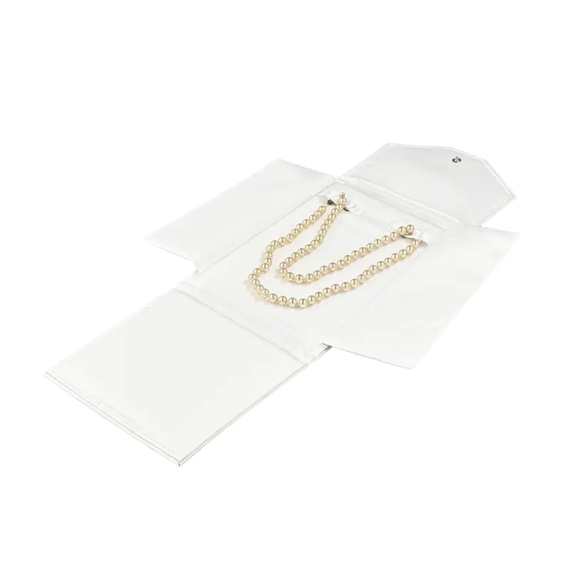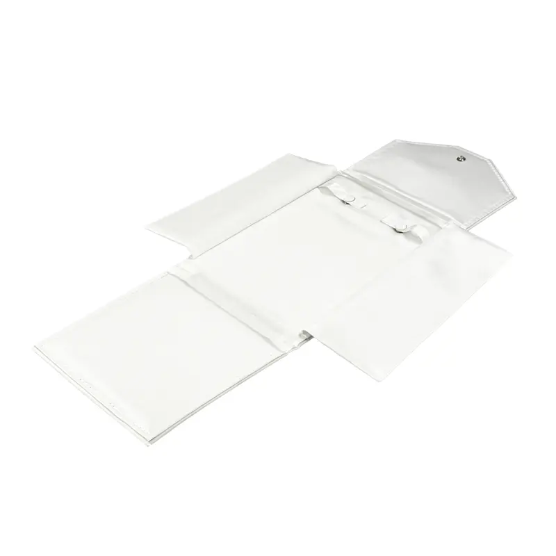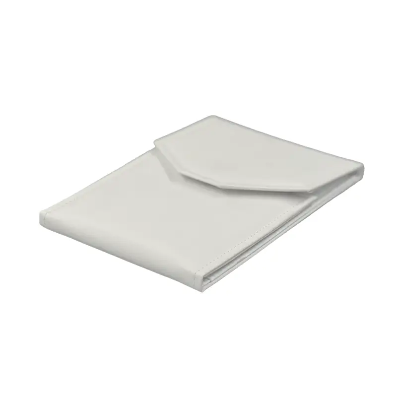 WHITE LEATHERETTE PEARL FOLDER LINED WITH WHITE SATIN INTERIOR. PACKAGED WITH A WHITE RIGID PAPER TWO PIECE BOX