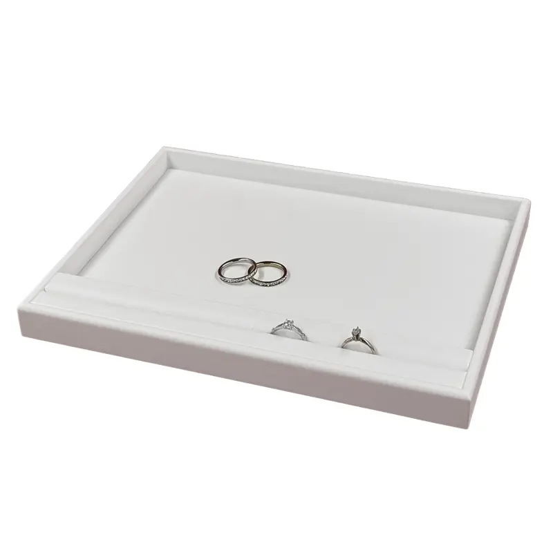 White leatherette. Generous display are for chains and earrings plus continuous slot for rings.