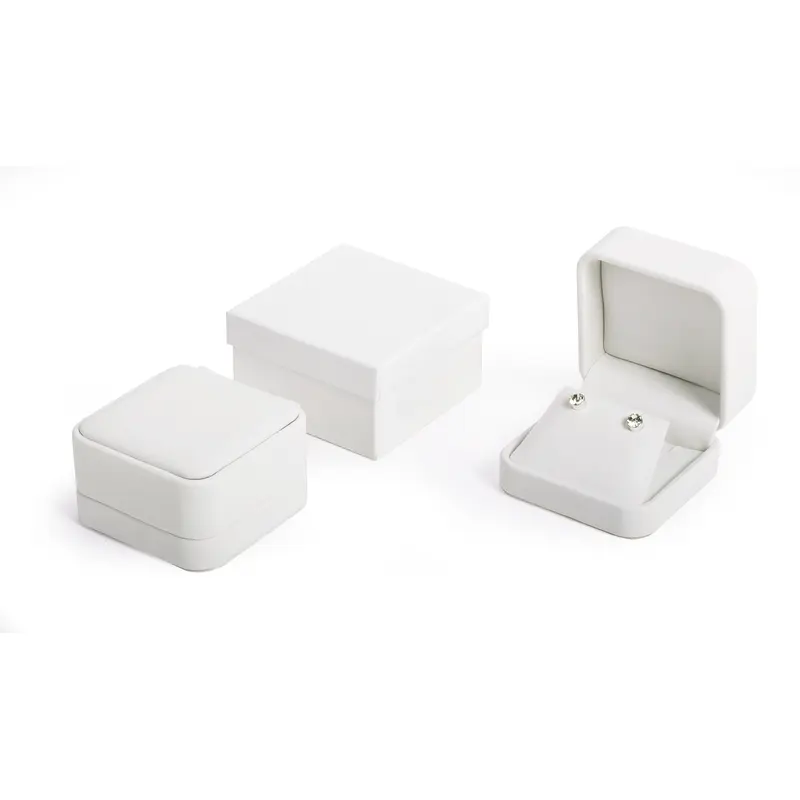 WHITE LEATHERETTE BOX THAT CAN BE USED AS A PENDANT BOX ALONE OR EARRING OR BROOCH BOX ALONE. tHE BOX CAN ALSO BE DISPLAYED AS AND EARRING/PENDANT COMBO BOX/ COMES WITH A TWO PIECE WHITE OUTER PAPER BOX.