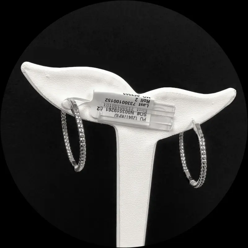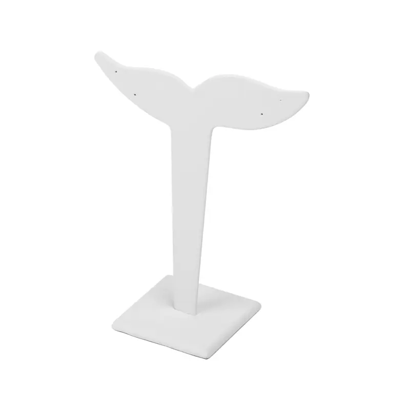 Decorative white leatherette earring stand with additional set of blind earring holes for option of displaying 2 sets of earrings. Plastic hidden clip on back of stand to hold tags.