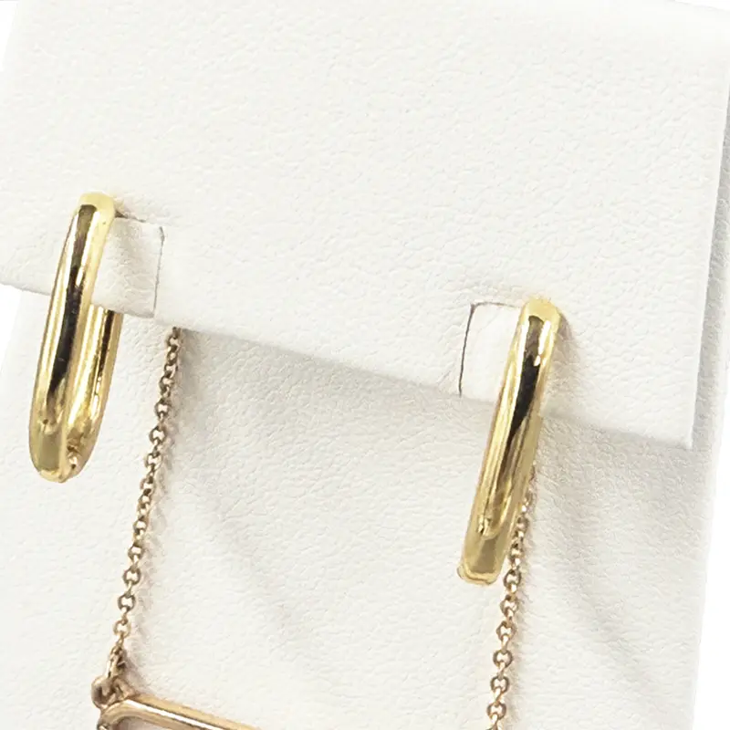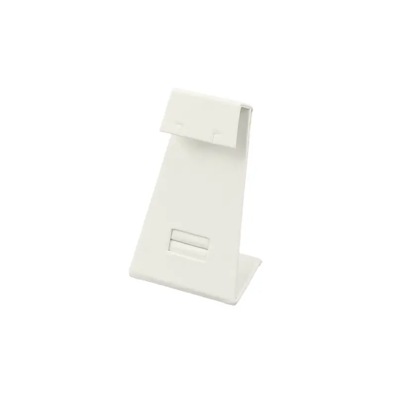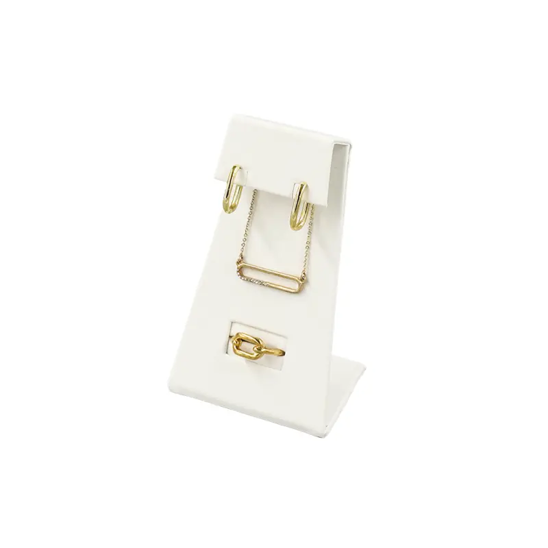 This decorative white leatherette combination stand for earrings, pendant and ring displays a full set of jewelry in an innovative, one-piece element. Flip top flange to access pendant slots, envelope in back for chain management and easy-slots for hassel free earring placement.
